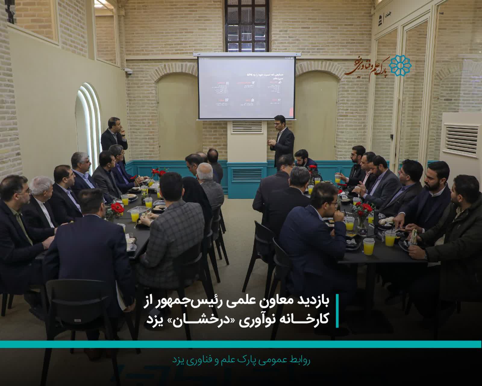 در ادامه این بازدید، «مجید شخصینیائی»، رئیس پارک علم و فناوری یزد، گزارشی از روند بازسازی کارخانه نوآوری «درخشان» ارائه کرد. وی با تشریح مراحل احیای این مجموعه و تبدیل یک فضای صنعتی غیرفعال به مرکز فعال نوآوری، بر اهمیت تکمیل این فرآیند و توسعه فضاهای تخصصی تأکید کرد.